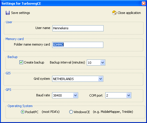 User: enter the name of the person who is going to work with the PDA concerned. The user name will be included in names of export files.